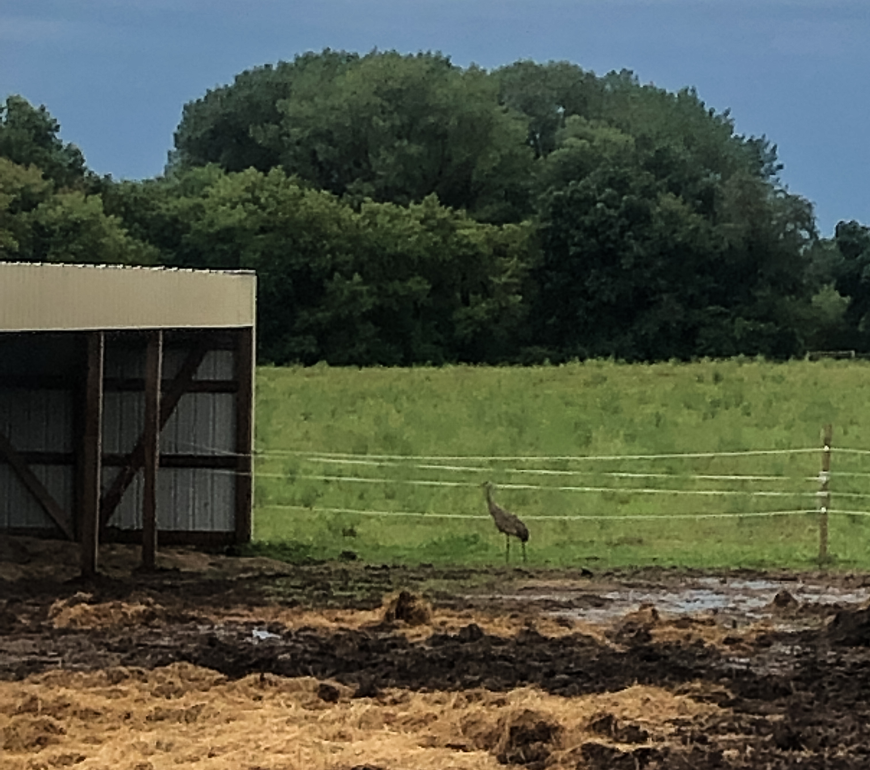 We like to encourage wildlife visits to our Ranch. Here we see Mr. or is it Mrs. Crane coming for breakfast in the rain.