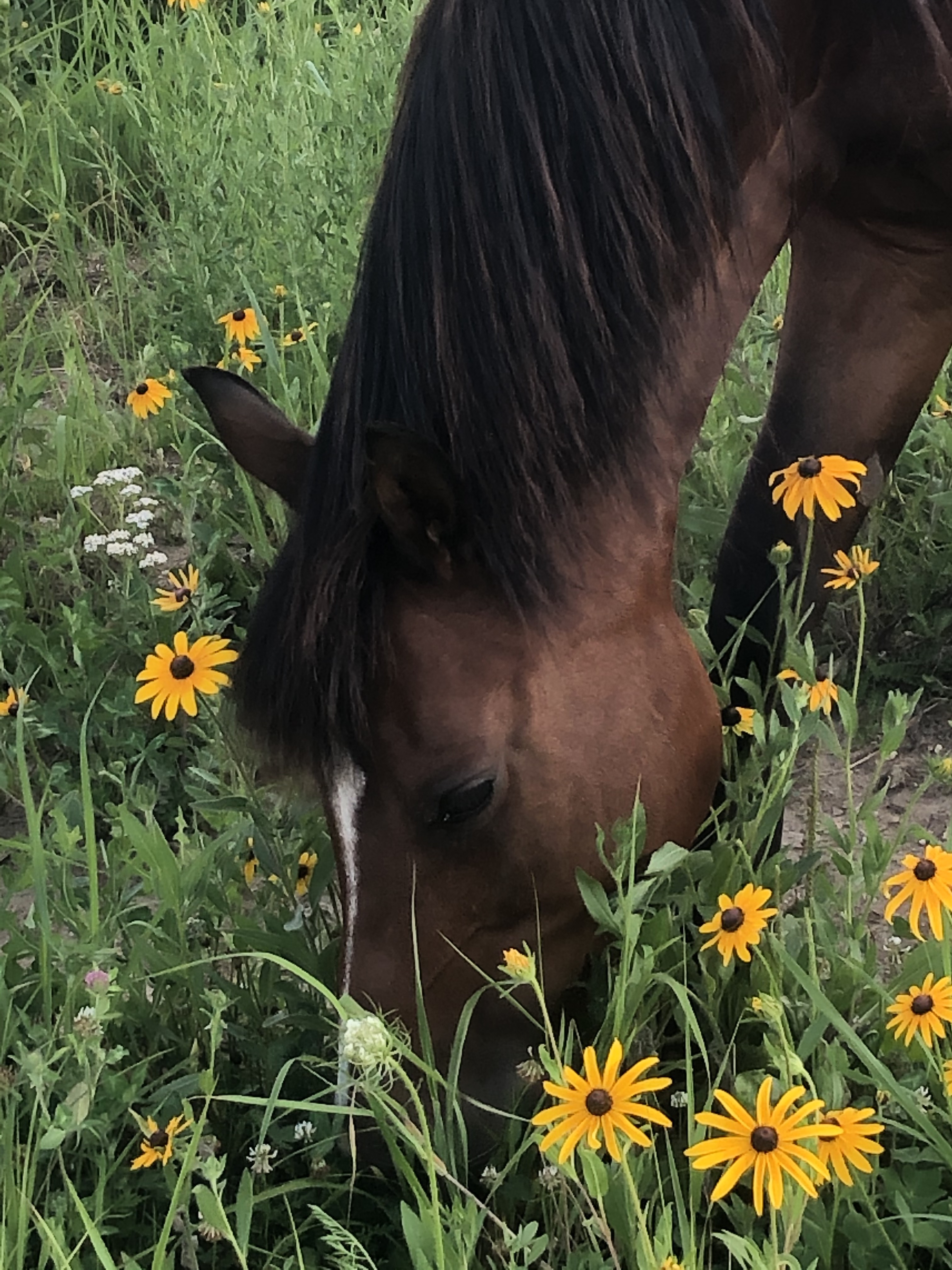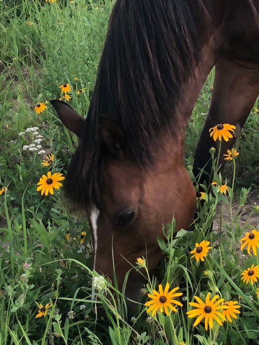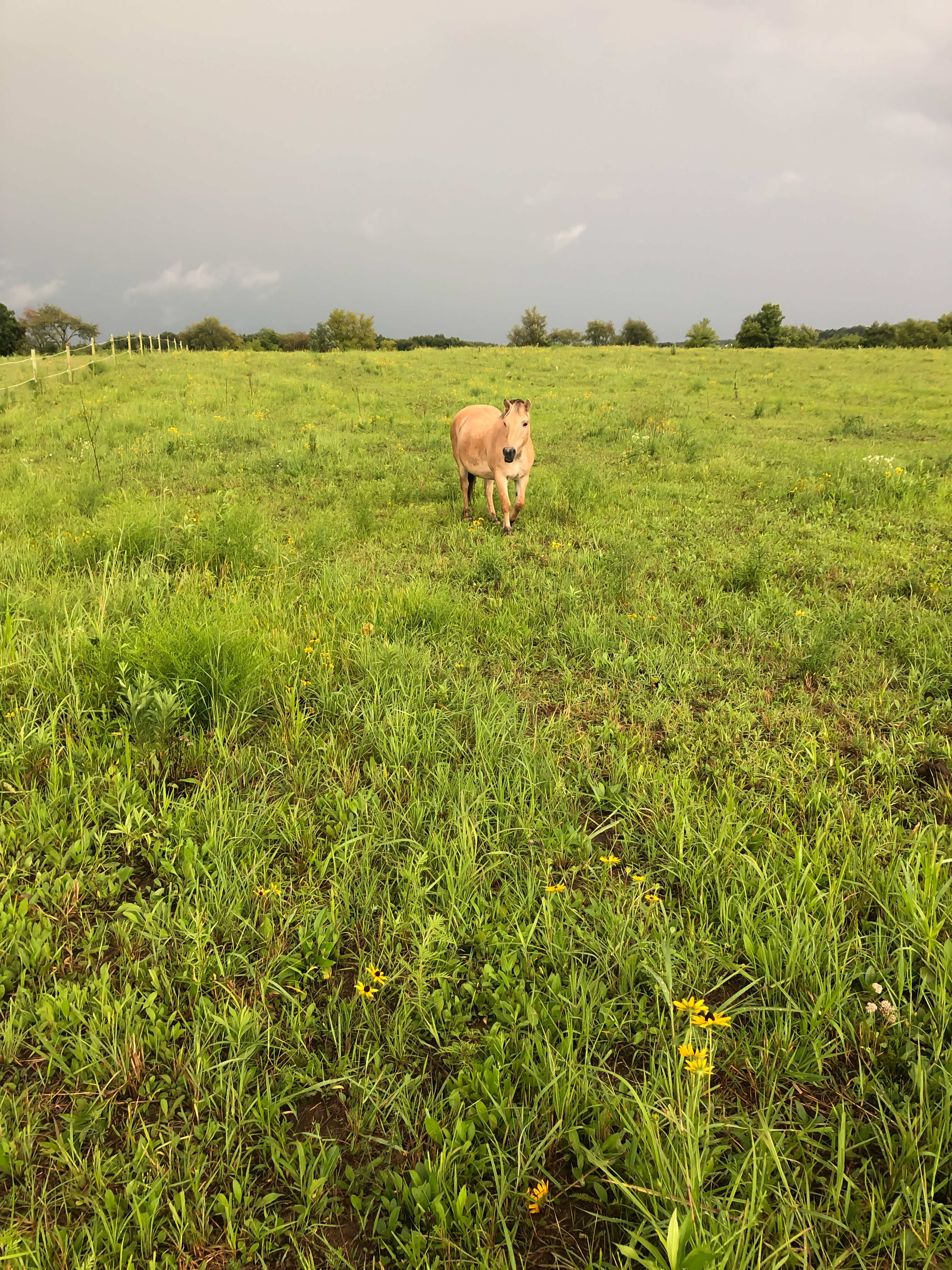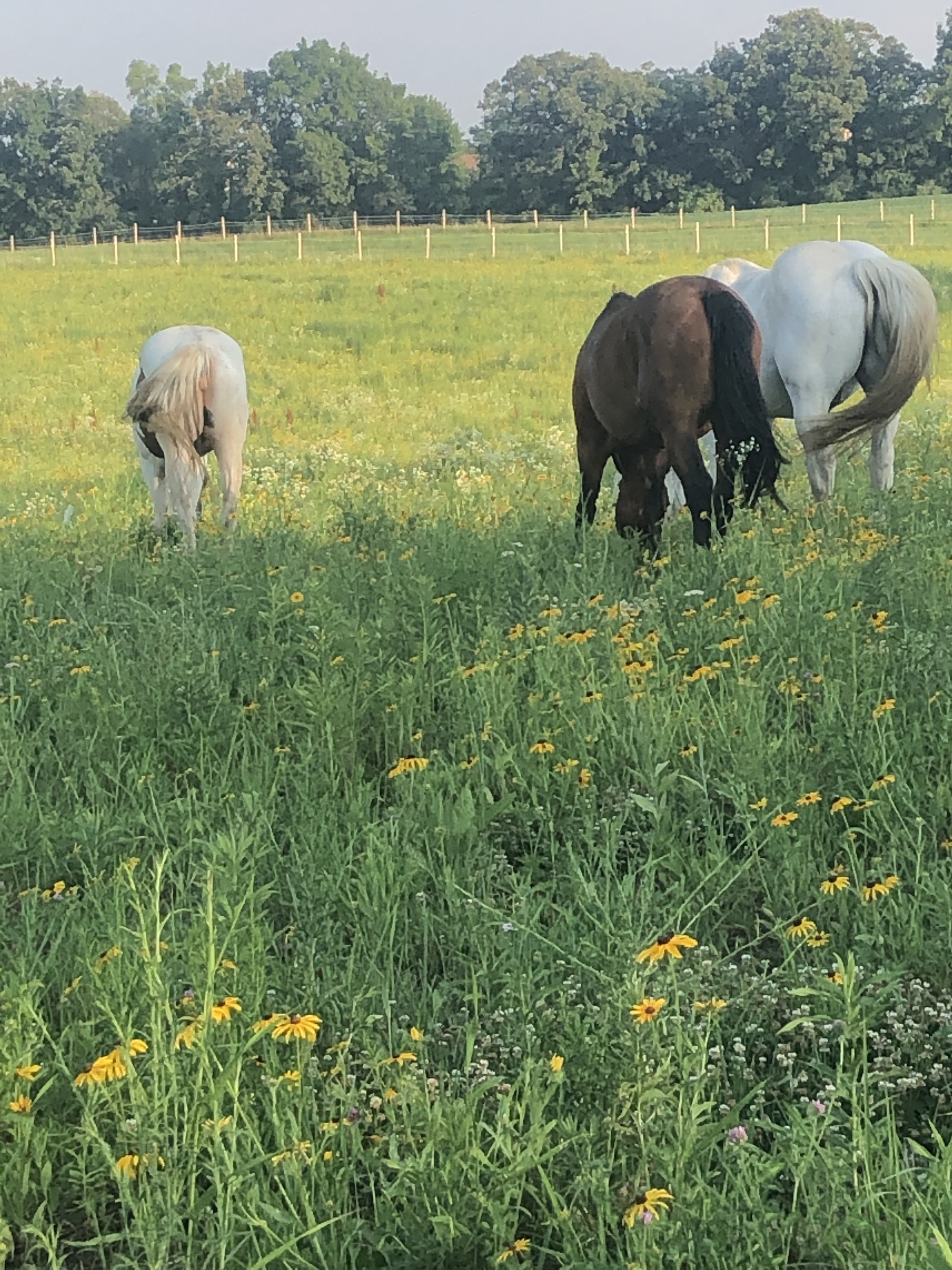 The next pasture we call our summer pasture because it is filled with warm season/natural/native grasses. If I could plant all our pastures with native grasses, I would. They are prairie grasses, native to this area and they just understand Illinois and all it’s fickle weather conditions and it decides to grow anyway. We have Big Bluestem, Indian Grass, and Canada Wild Rye in there. Intermingled and sometimes taking over in areas, we planted forbs. Some would call them wild flowers, some would call them weeds. Their more naturalistic name is forbs. Things like Black Eyed Susan, Yarrow, Culvers Root, Wild Quinine. Oh and don’t forget clover, both white and purple. We have that in both pastures. The horses do eat all of them from time to time, depending on what they need.