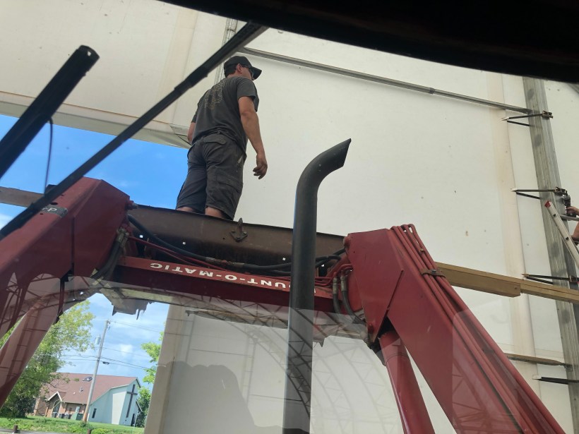 We also got started putting up a door on one side of our arena. This has been an ongoing project for many months. This week, we tried to mount the medal piece the barn door will slide on. Unfortunately, after risking life and limb, on ladders and tractor buckets high in the air, the measurements were off. So, it didn’t get finished, as we ran out of time.