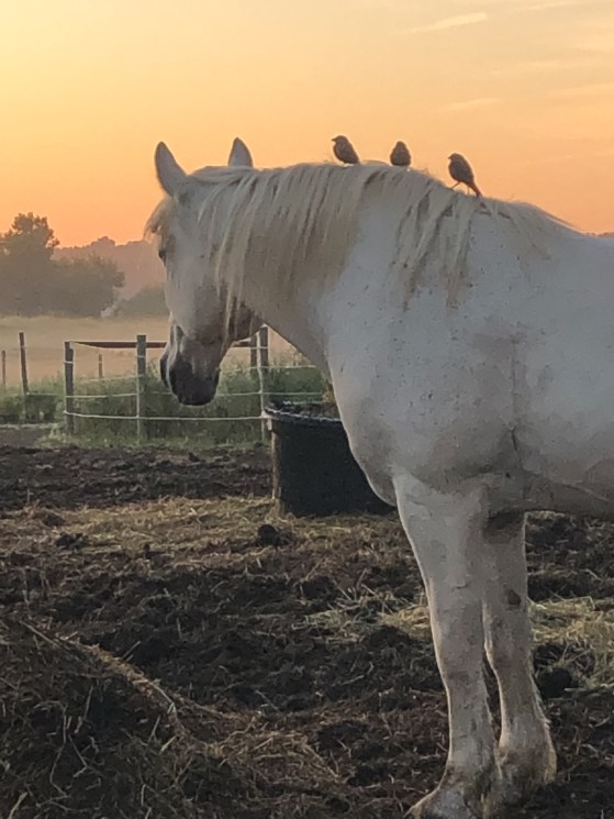 I did Google it. But didn’t get an exact answer. Some say the birds are trying to keep warm. Some say they are picking insects and food off the horses. I wish that one were true. I wish the birds would eat ALL the flys and ALL the mosquitoes. But they don’t. Maybe they eat some, but not enough to tell with the naked eye.