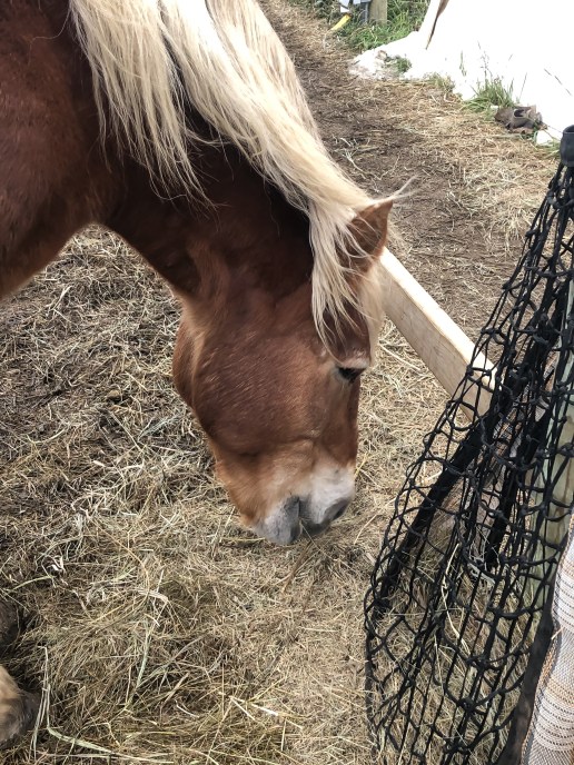 We have all sizes. Small square bale size, like the photo above. We also have two round bale sizes that we used for round bales this summer, but now we can’t find round bales that are horse quality and also priced decently, so we’ve set up goal post looking stations and hang the nets on those to keep them mostly off the ground and easy to fill with loose hay.