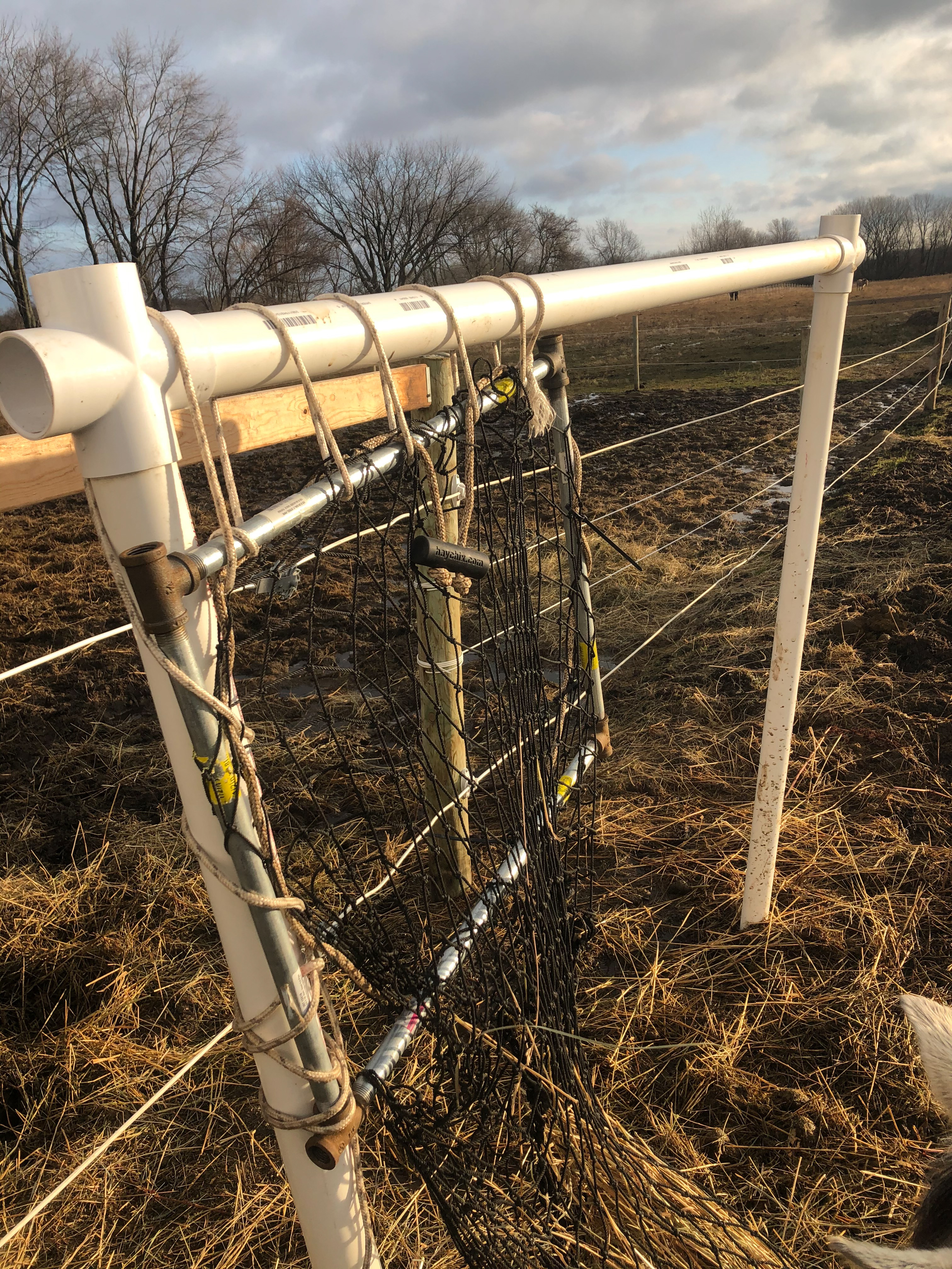 This is the second year we’ve used 100 gallon water tanks fitted with frames and nets from DIY Slow Feed Hay Feeders.