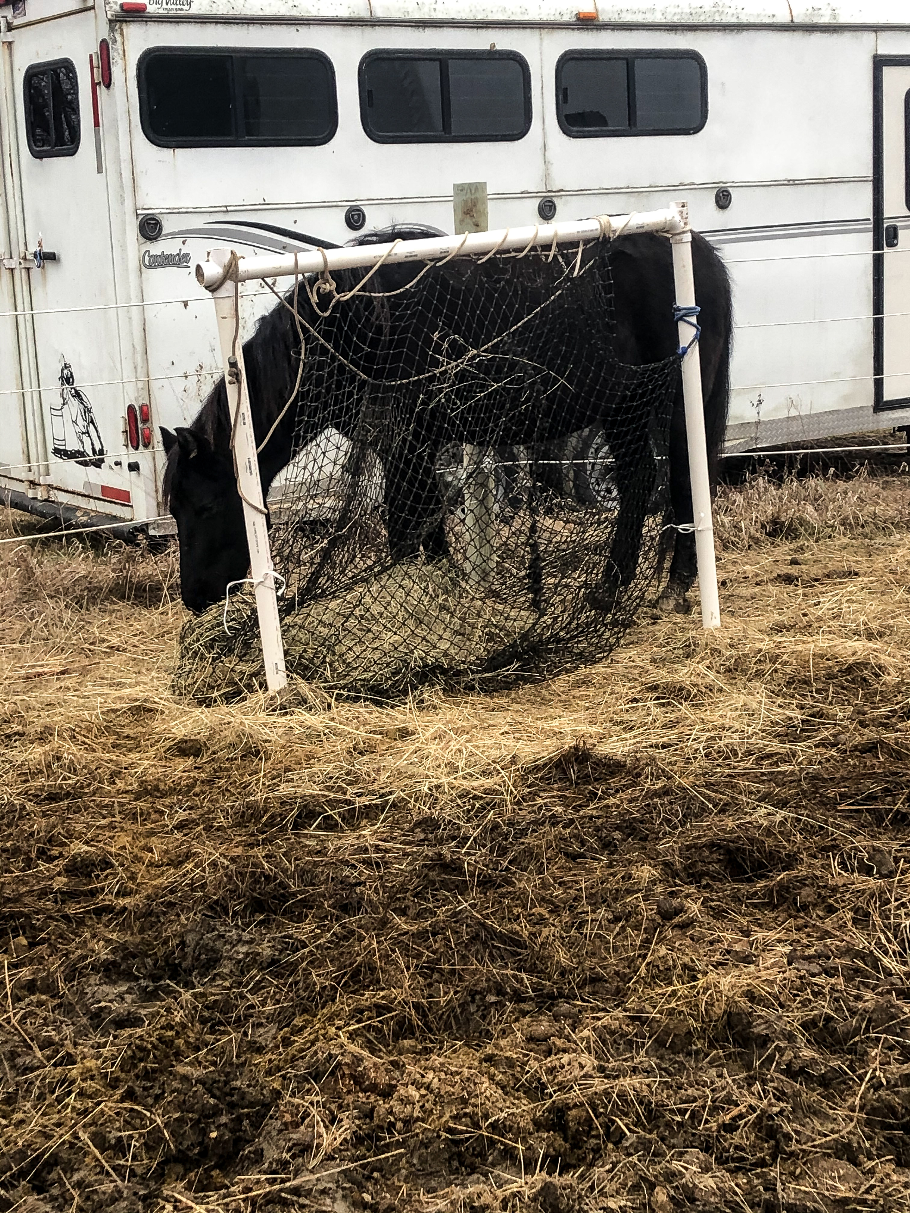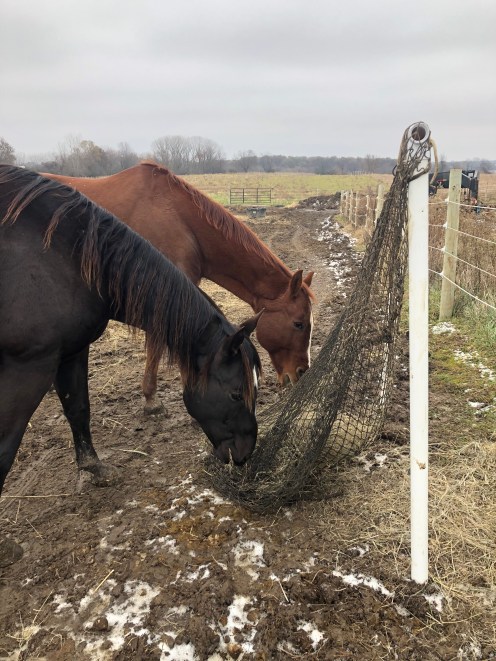 but we mostly just put those inside our arena/shelter as when it gets muddy they turn into a big muddy mess and are very hard to use. The zippers get stuck and it just doesn’t work. We used them a lot last year, but have turned to using hay nets much more this year. The hay pillows are great when the weather is nice, but this is Illinois and this time of year, the weather is never nice.