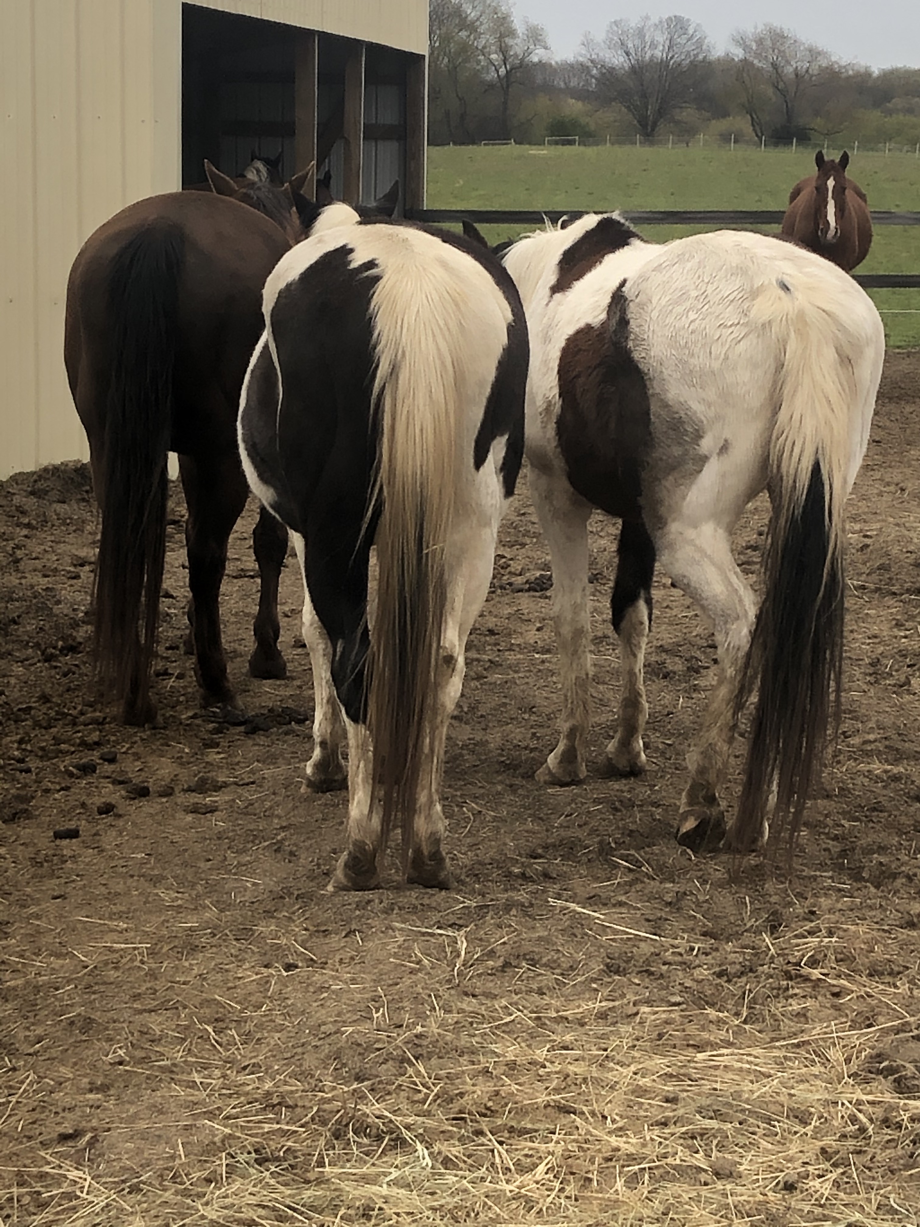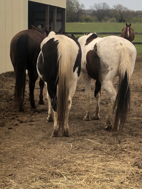 Many times you will see horses standing with faces next to another horse’s tail. The tail is helping to keep the bugs off the other horse’s face. “Happy to help.”