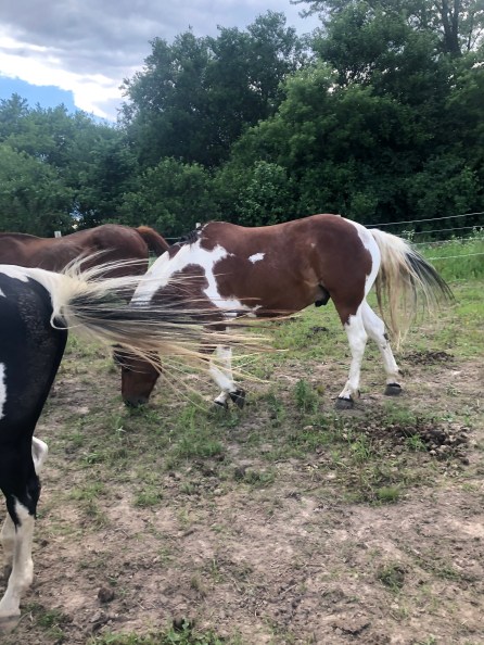 So, the reason for having three pastures is that we rotate the horses on and off them. Lately, each pasture has had the horses in it for about two weeks. After those two weeks, we rotate the herd to another pasture. Ideally, we like the grass to be close to shin or knee height. That doesn’t always happen, but the longer it is, the less sugar and the better it is for horses. Unlike pastures for cows and other livestock, we aren’t trying to fatten our horses up, so we want low energy pastures. We want nutrition, so it can’t be too long, but if it’s too short, it contains more sugars which equals fat horses and sometimes diseases such as Insulin Resistance and Laminitis.
